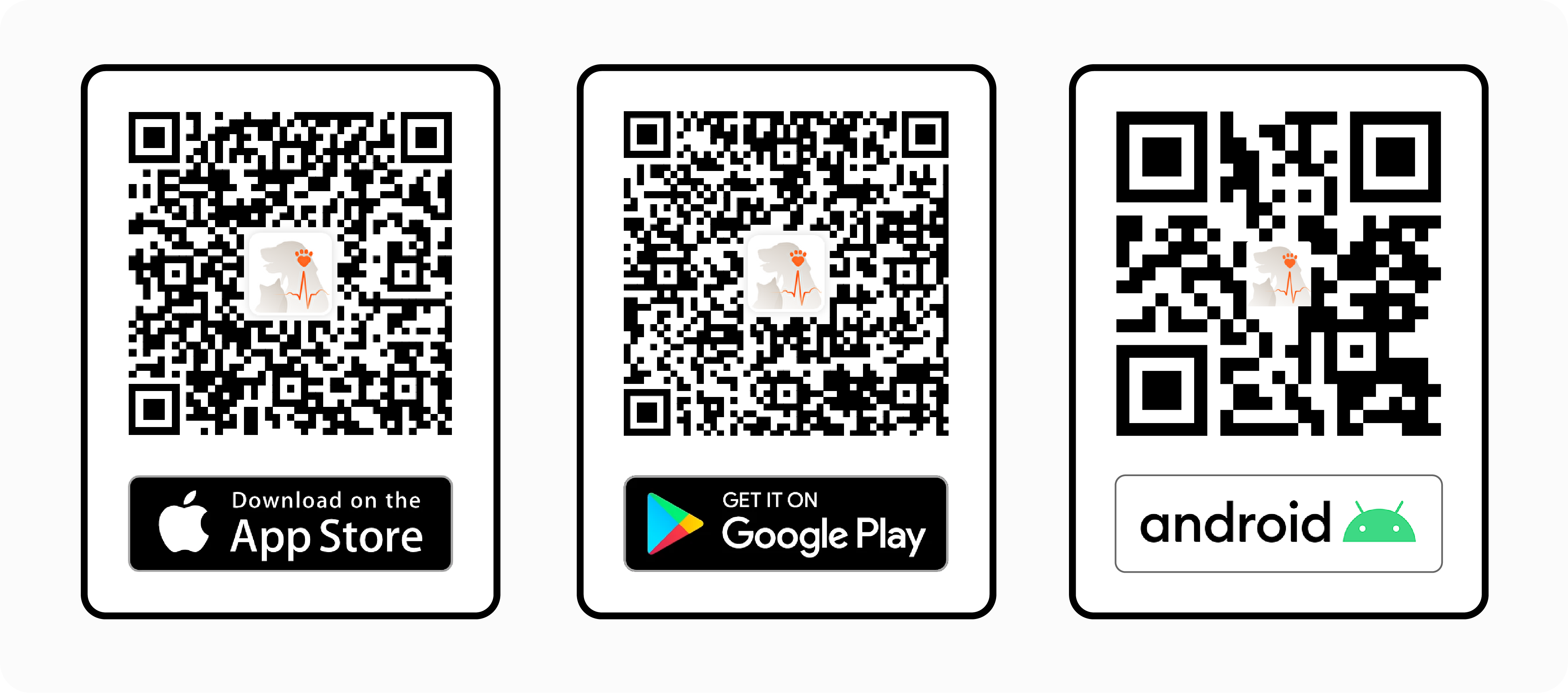 请扫描移动设备系统对应的二维码,或在手机应用市场搜索“星爱宠”App,下载安装